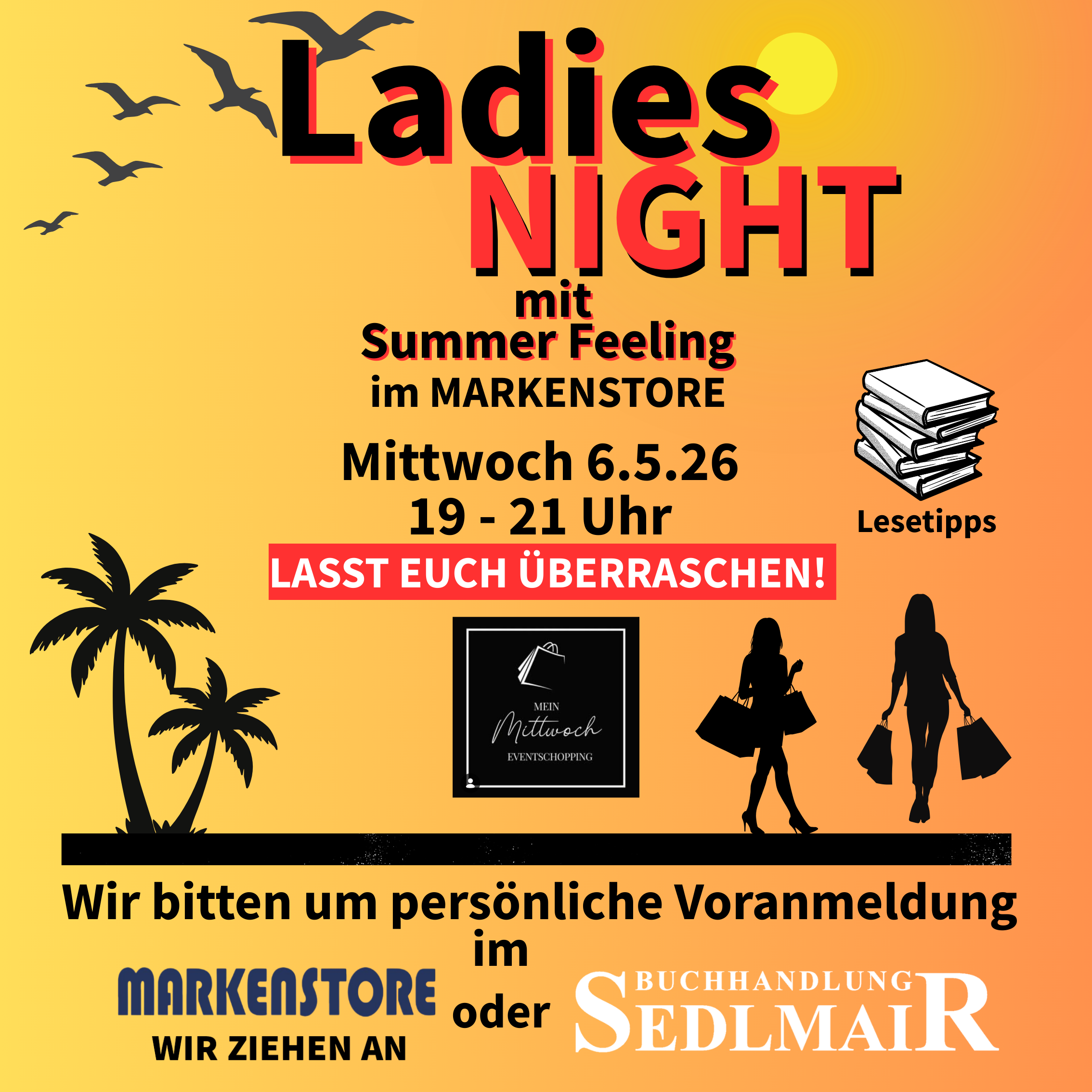 Ladies Night mit Summer Feeling im Markenstore! Das nächste „Mein Mittwoch“ Event steht vor der Tür! Nur mit Voranmeldung! Karten sind bereits leider ausverkauft!