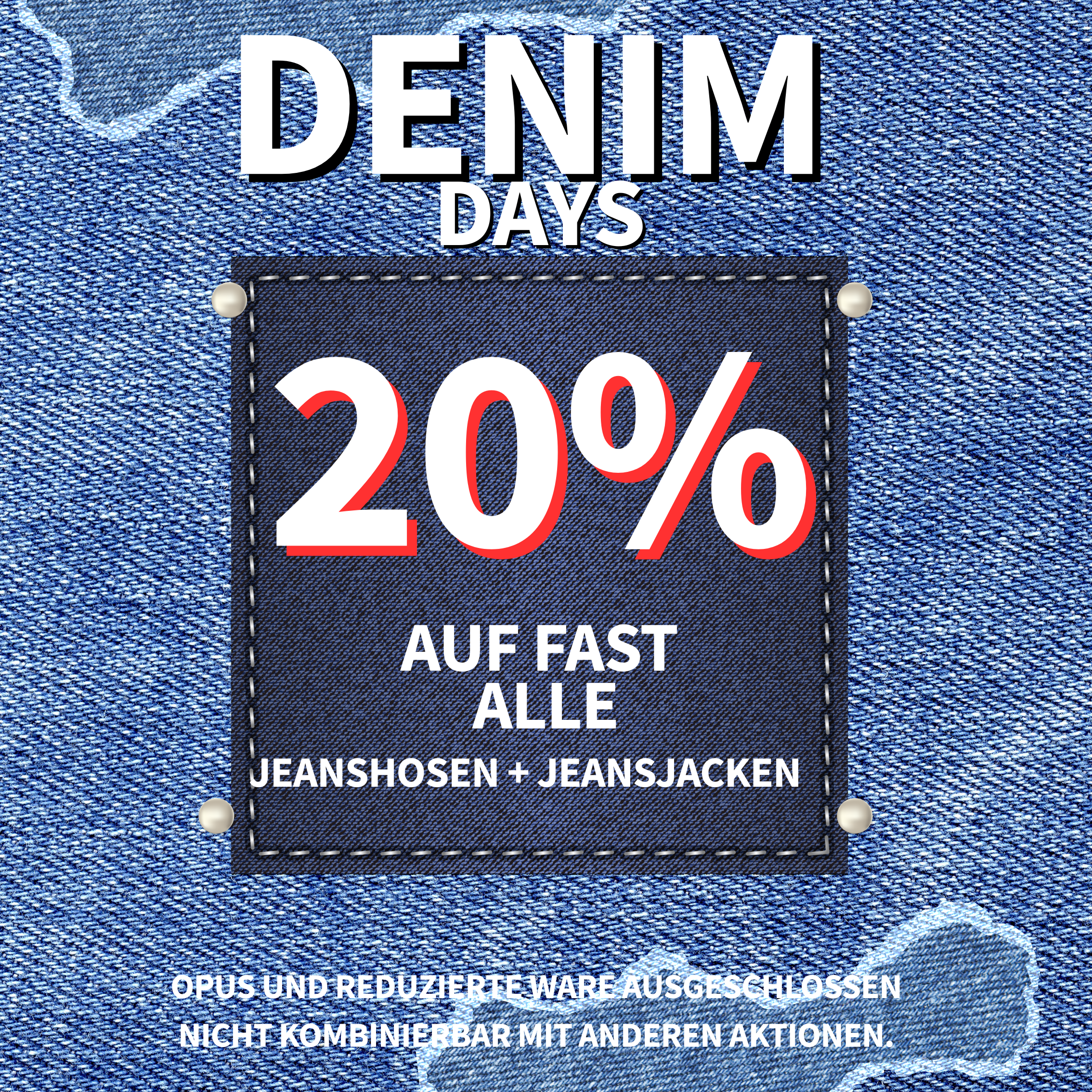 aktuelle Aktion 04/2026 Zeige grösseres Bild DENIM DAYS! 20% auf fast alle Jeanshosen und Jeansjacken! Ähnliche Beiträge